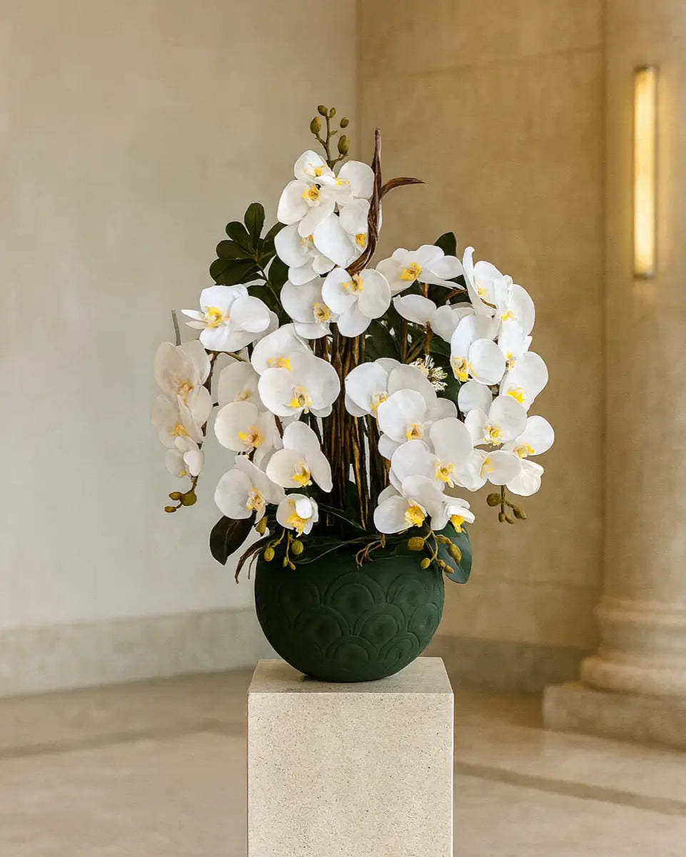 With its dazzling beauty, Orchid Palace adds a sophisticated and noble touch to any space it is in. Reflecting the unique aesthetics of nature with its realistic details and elegant flowers, this special arrangement stands out as the symbol of luxury and elegance.